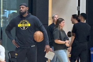湖人训练备战揭幕战 詹姆斯抱着篮球场边观摩&与教练攀谈