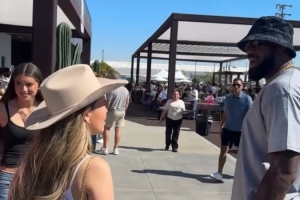 球迷回顾昨日参加湖人亲子互动活动 詹姆斯与女球迷握手合影