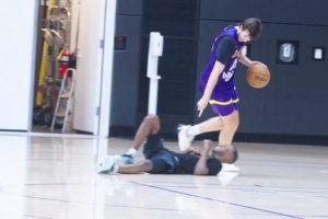 不要太过分🤣!里夫斯背身运球晃倒助教 并指着后者疯狂嘲讽