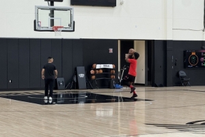 直播吧10月21日讯 开拓者随队记者Sean Highkin晒照,开拓者后卫亨德森训练后单独进行了投篮练习,杨瀚森的翻译刘禹铖(克里斯)在旁边帮他捡篮板。