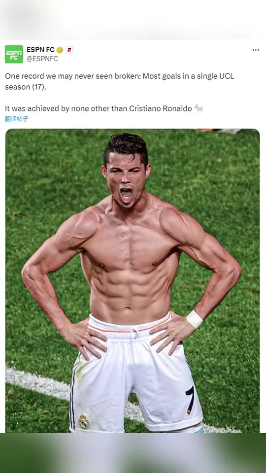 ESPN:C罗这一项记录可能永远不会被打破,单个欧冠赛季17个进球